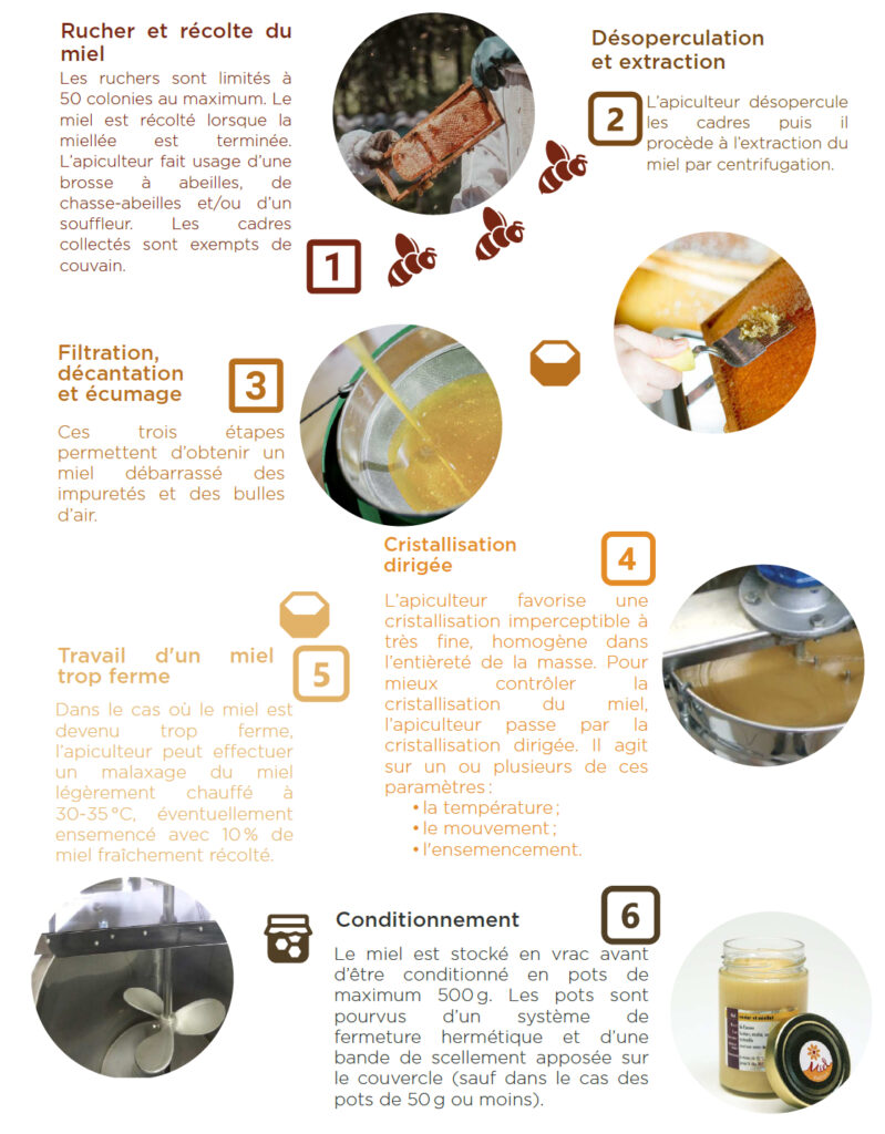 La cristallisation dirigée constitue une des étapes de fabrication les plus importantes. Elle consiste à agir sur un ou plusieurs des paramètres suivants : la température, le mouvement et l’ensemencement. Lorsque l’apiculteur intervient sur la température du miel, il s’agit de l’abaisser aux alentours de 14 °C pour accélérer la cristallisation et obtenir un grain le plus fin possible. Si l’apiculteur intervient sur le mouvement, le miel est mélangé à intervalles réguliers avec un malaxeur afin de favoriser la formation de cristaux et d’éviter l’apparition d’une texture trop ferme. La technique de l’ensemencement, prévue pour les miels à cristallisation lente, consiste à amener 10 à 15 % de miel indigène très finement cristallisé dans la masse non cristallisée afin d’amorcer la cristallisation. Pour assouplir un miel devenu trop ferme, le miel est réchauffé prudemment à une température comprise entre 30 et 35 °C puis malaxé et éventuellement ensemencé avec 10 % de miel fraîchement récolté pour lui redonner sa stabilité initiale.