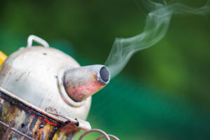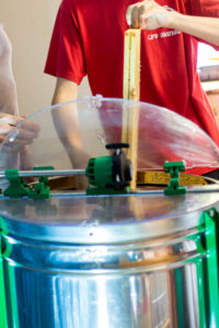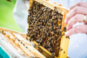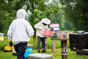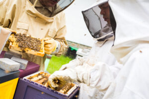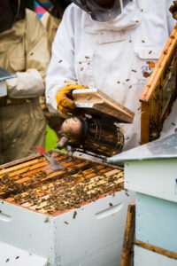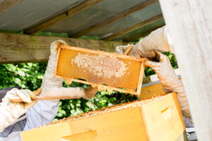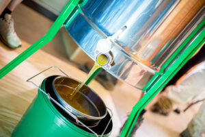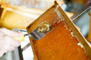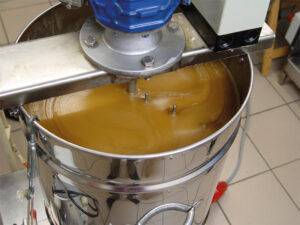 Après avoir retiré les cadres des ruches, l’apiculteur procède à leur désoperculation et à l’extraction du miel par centrifugation. Ensuite, le miel est filtré et laissé à décanter avant d’être écumé pour retirer les impuretés et les bulles d’air.
